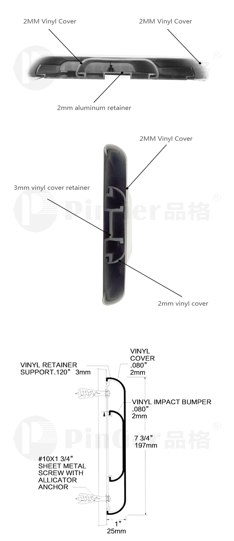 Pinger-Wandschutzvorrichtungen bestehen aus den folgenden Teilen: 2 mm dicke Vinylabdeckung, 2 mm dicke Aluminiumhalterung.