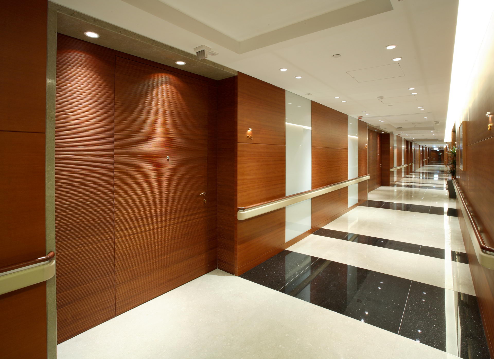 To assist patient mobility and protect the walls from trolley damage, the Handrail HR#1593W was installed throughout the Passage Corridor.