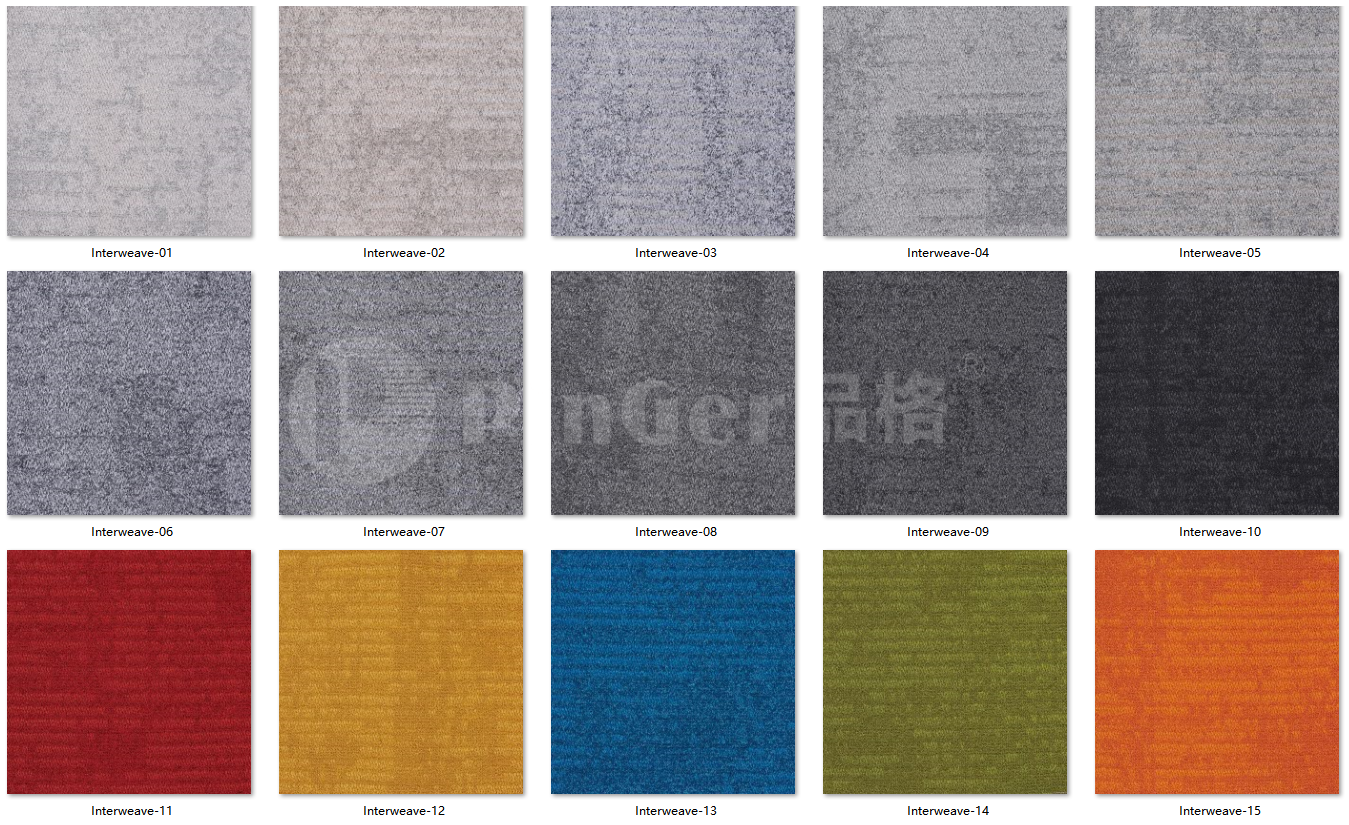 • Satte Farben : Es bietet Farben von Hellgrau (Interweave – 01) bis Tiefschwarz (Interweave – 10) sowie leuchtende Farben wie Rot, Gelb, Blau, Grün und Orange (Interweave – 11 bis Interweave – 15). Es kann flexibel an die Hauptfarbe des Raums angepasst werden, um einen persönlichen und lebendigen Geschäftsraum zu schaffen.