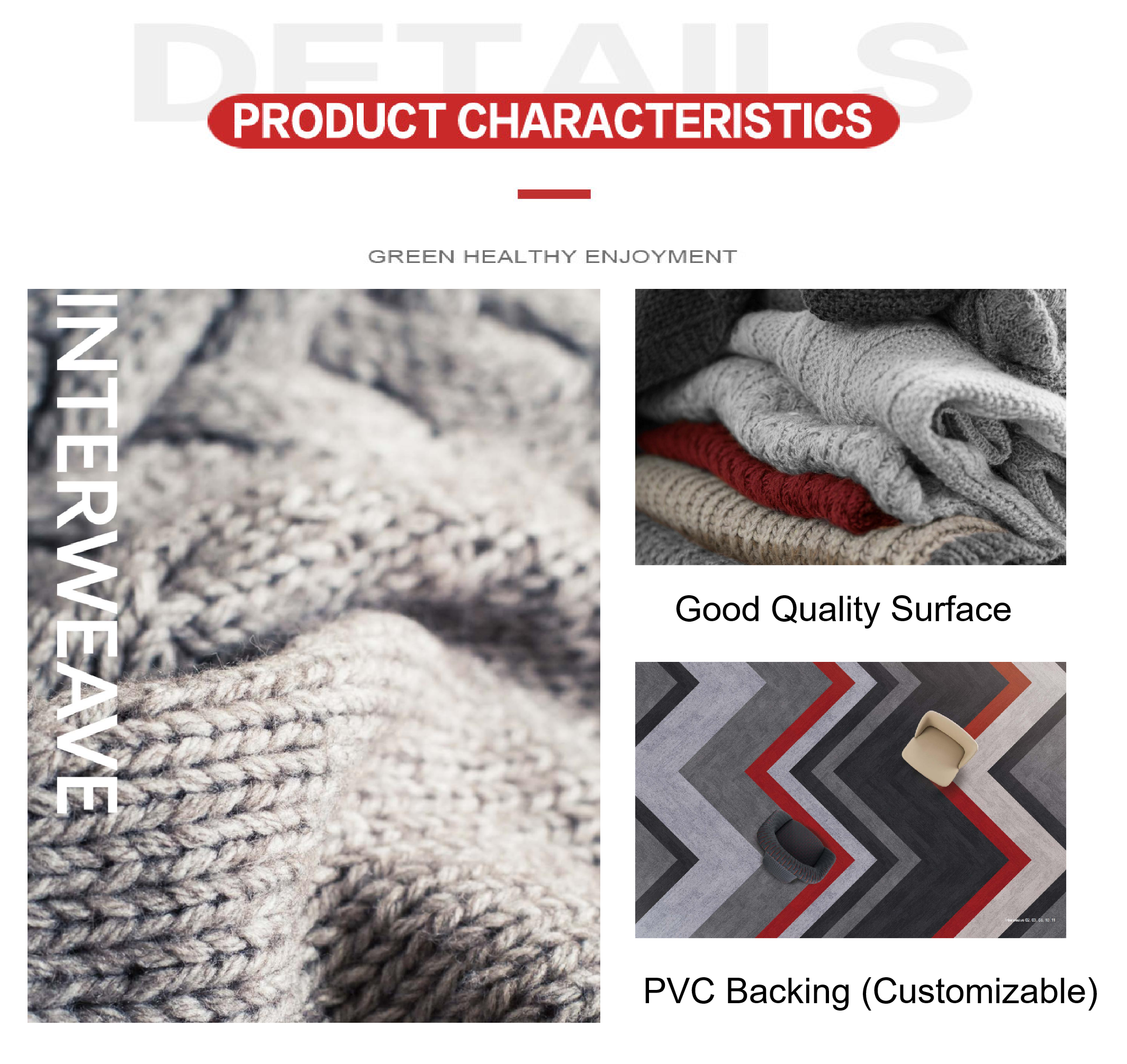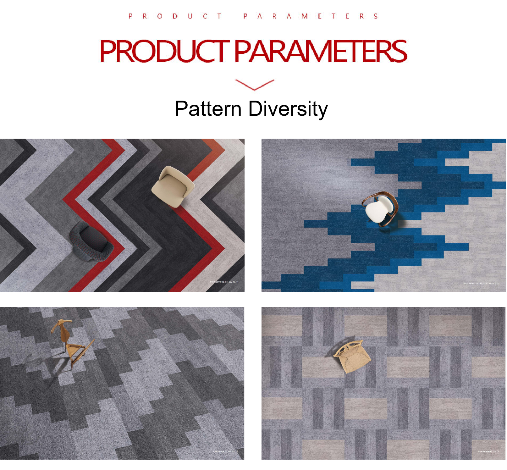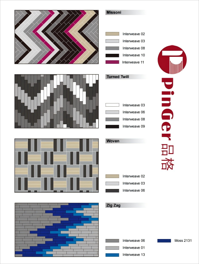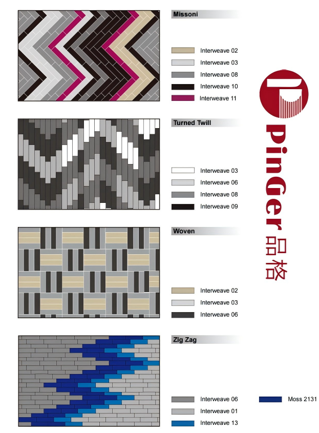 • Verschiedene Muster : Es umfasst Musterserien wie Missoni , Gedrehter Köper , Gewebt , Und Zickzack . Zum Beispiel die Farbverflechtung der Missoni Serie und die dynamischen Zickzacklinien der Zickzack Die Serie kann den Dekorationsanforderungen von Räumen unterschiedlicher Stilrichtungen gerecht werden und der Geschäftsumgebung eine künstlerische Atmosphäre verleihen.
