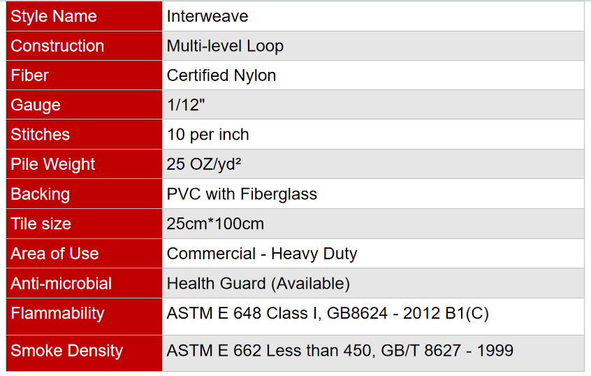 In gewerblichen Räumen sind Abnutzung und Verschleiß unvermeidlich – Interweave hingegen ist ein echter Hingucker. Seine mehrstufige Schlingenstruktur, zertifizierte Nylonfasern und die hochdichten Nähte sorgen dafür, dass es jahrelangem, starkem Fußgängerverkehr, verschütteten Flüssigkeiten und täglichem Gebrauch standhält. Verabschieden Sie sich von häufigem Austausch – Interweave ist eine Investition in langfristige Schönheit und Leistung.